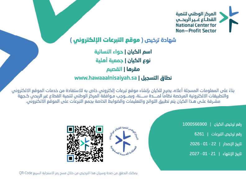 جمعية حواء النسائية هي منظمة خيرية تهدف لدعم الأسر المحتاجة وتمكين المرأة عبر مشاريع نوعية تزرع الأمل وتغيّر حياة المستفيدين.